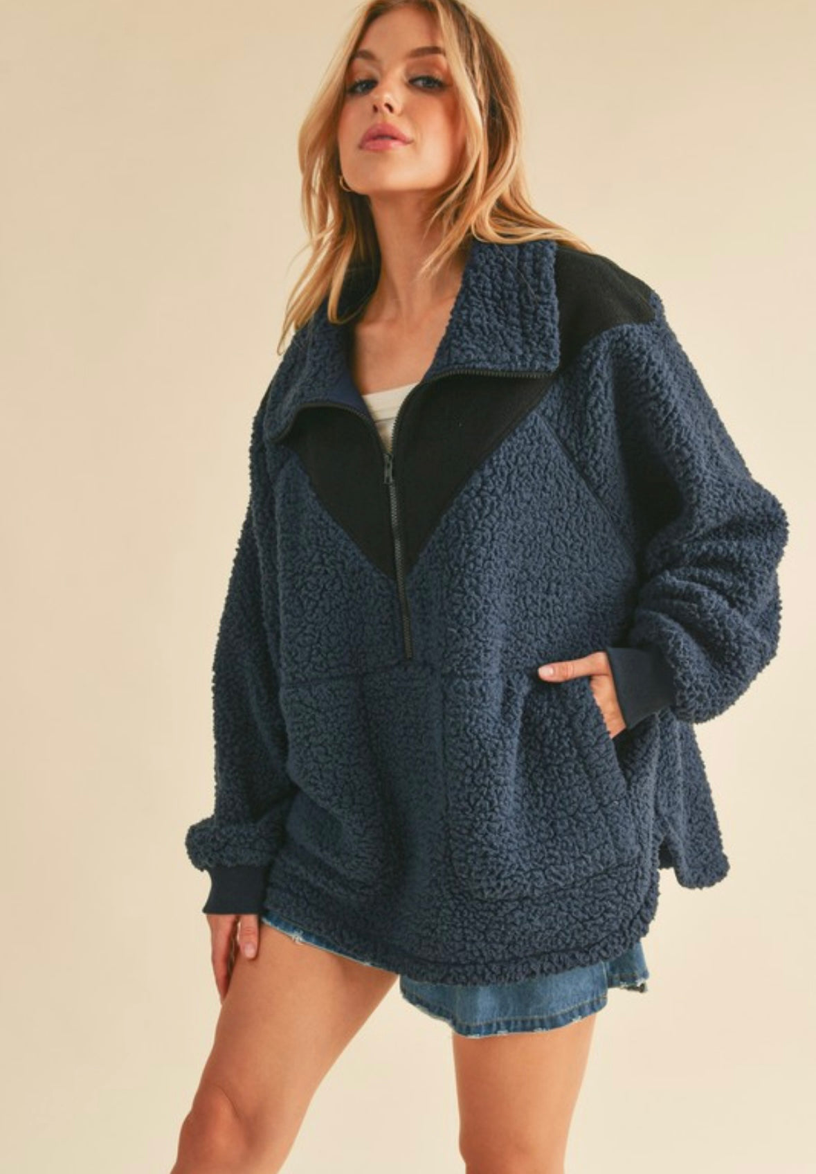 -Oversized pullover -Soft, textured sherpa fleece material -Features a half-zip front, a high collar, and a cozy, relaxed fit -Navy... Read more