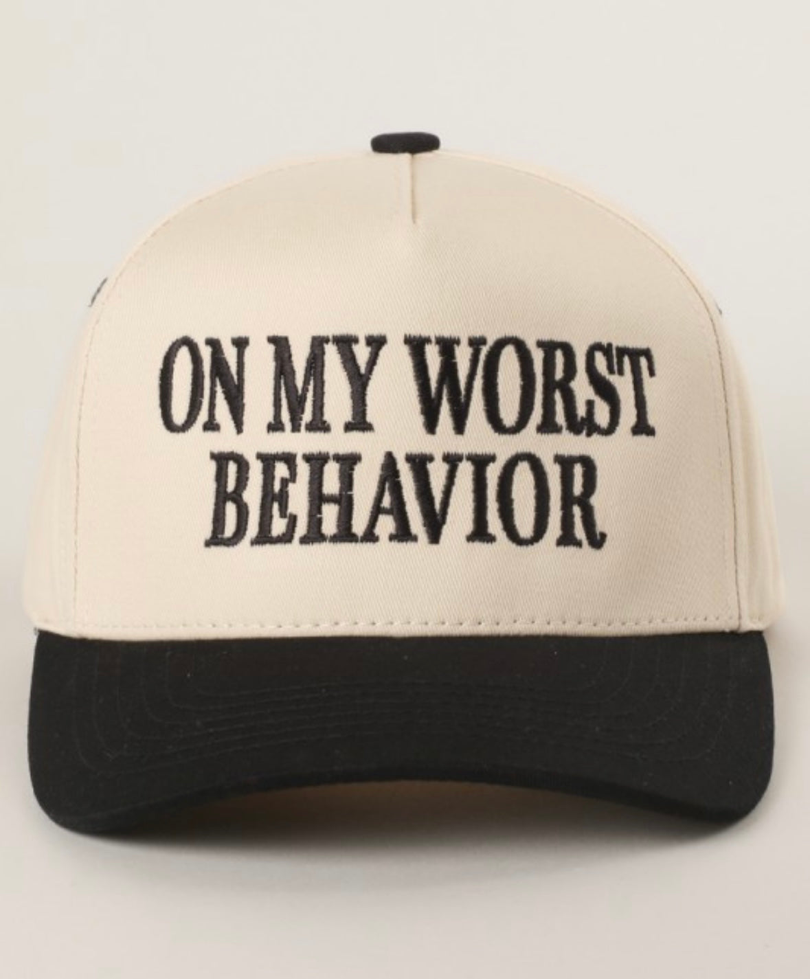 This isn’t just a hat; it’s a bold statement piece. Featuring “On My Worst Behavior” embroidery in black shade, this... Read more