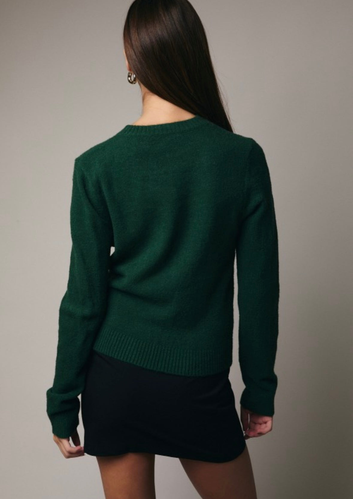 -Dark green holiday sweater with a festive yet chic design. -Features the word “merry” spelled out in small, shimmering rhinestones,... Read more
