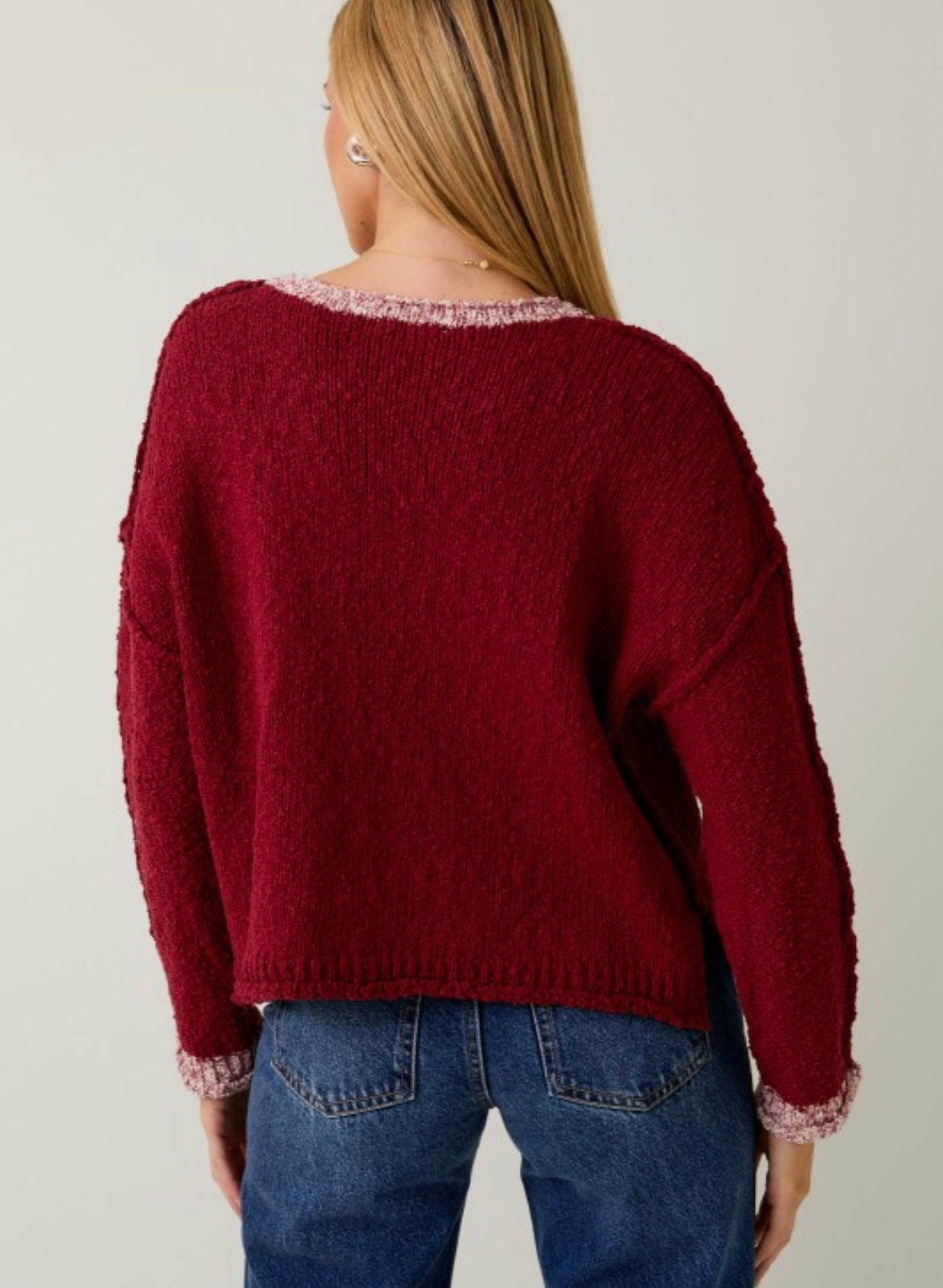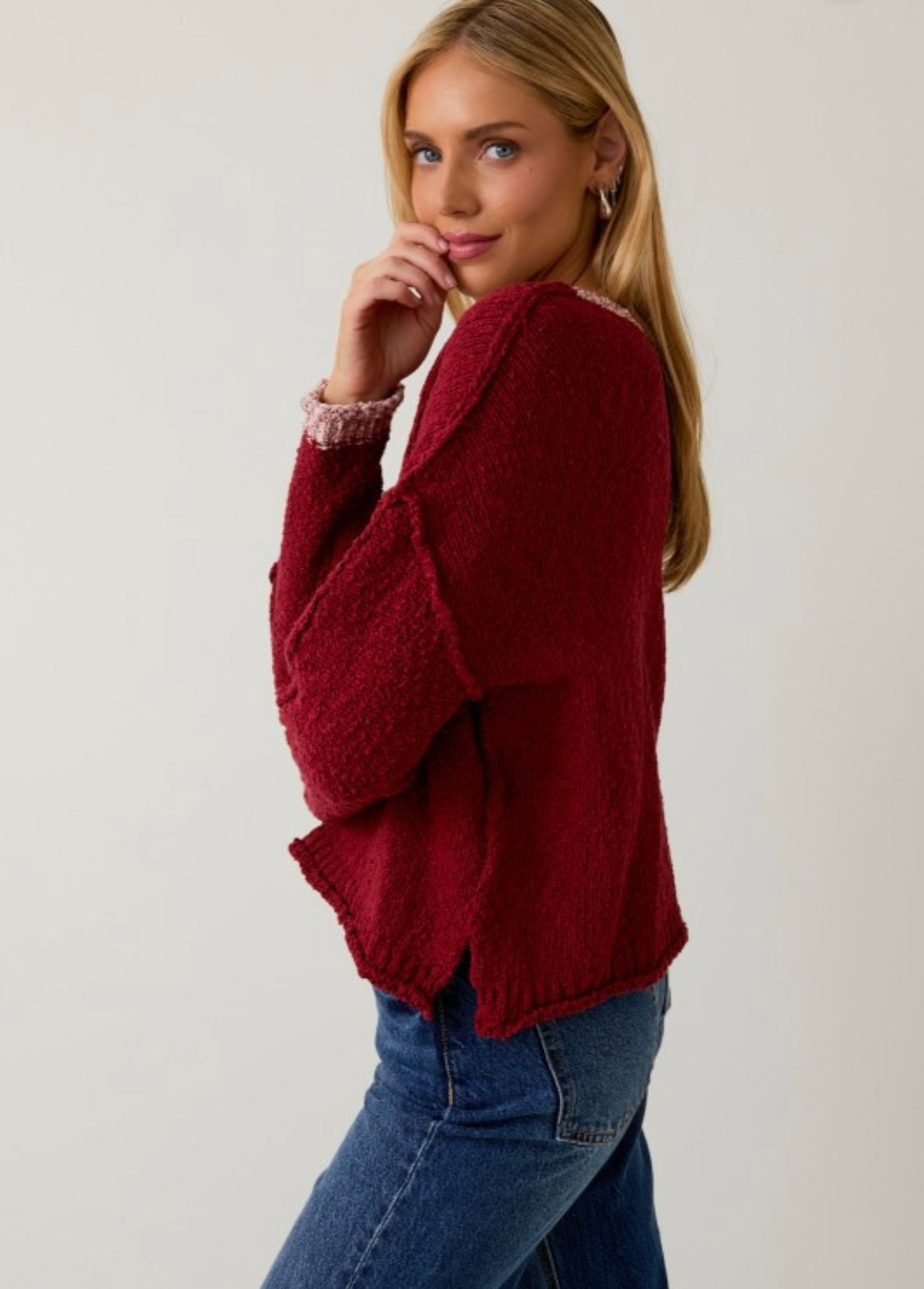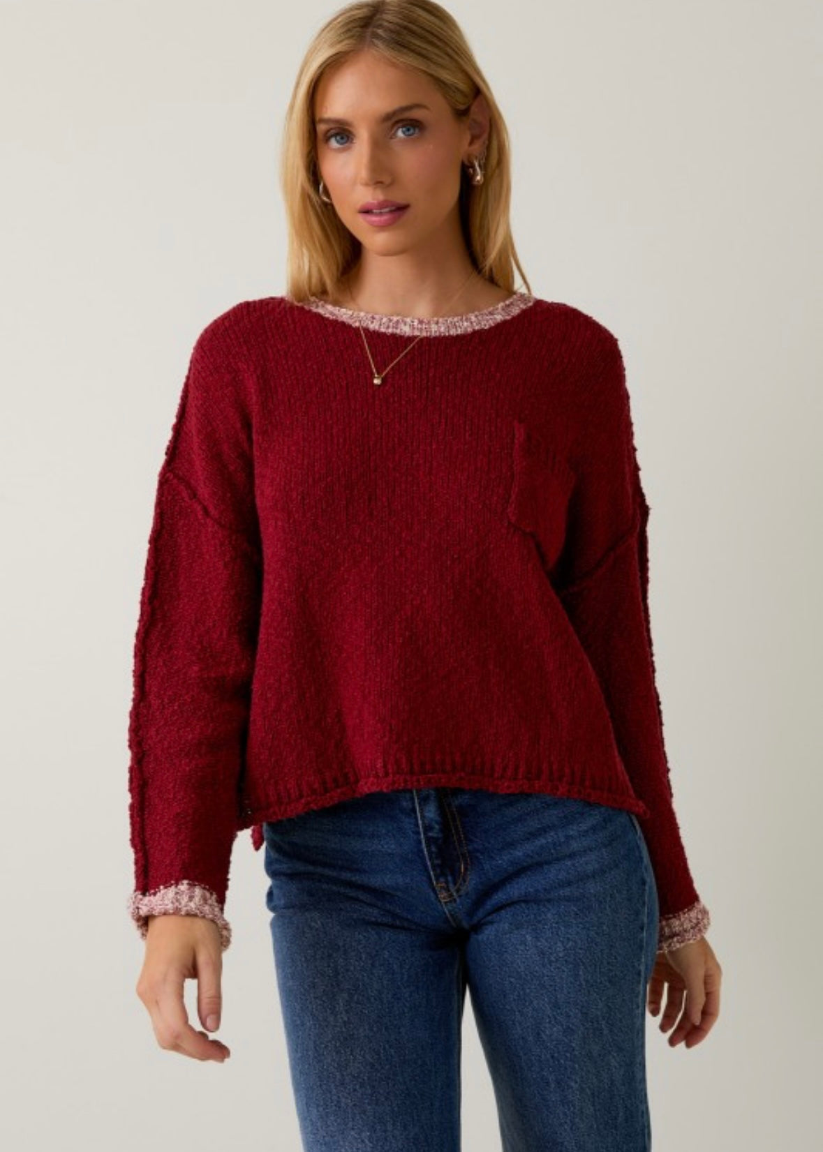 -Rich burgundy textured sweater -Pink-and-white trim along the neckline and sleeve cuffs -Round neckline -Drop shoulders -Single chest pocket -Raw-edge... Read more
